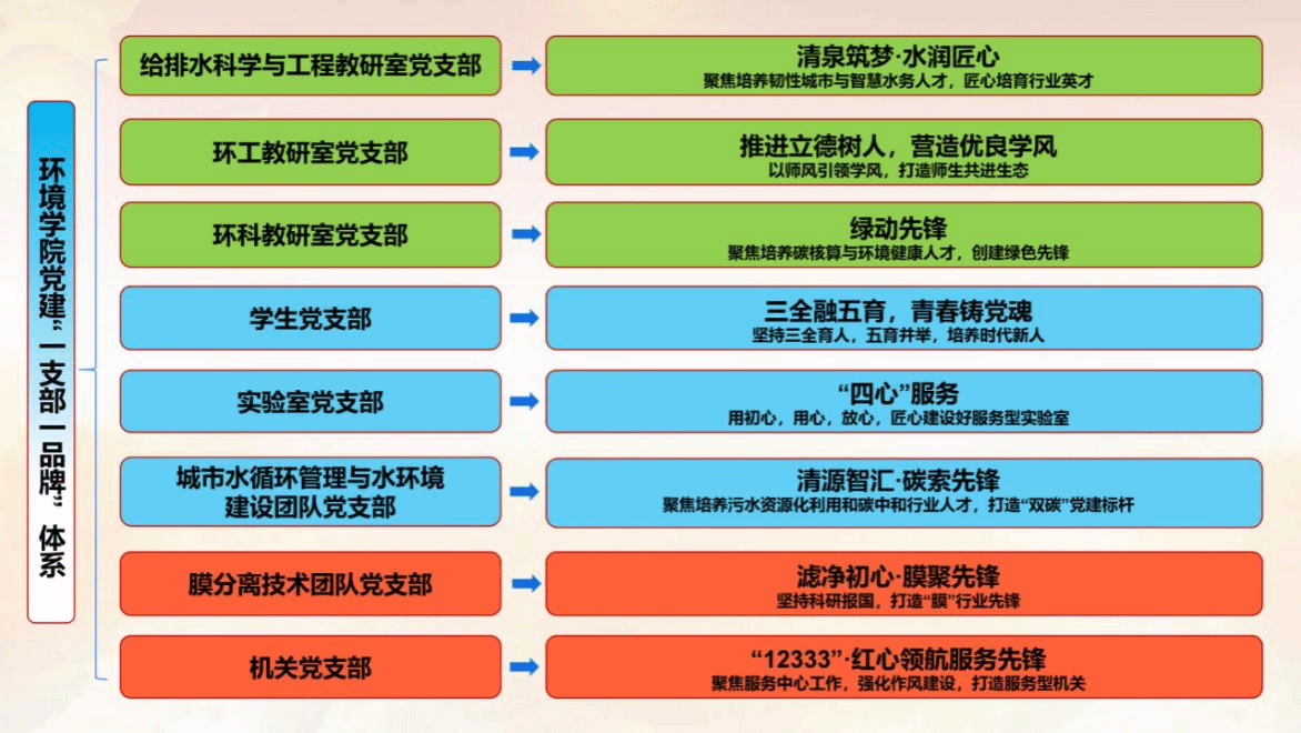坚守一个核心使命,推动基层党组织全面进步全面过硬。强化制度落实。落实党支部“三会一课”、谈心谈话、主题党日等制度并开展专项检查整改,每半年查阅一次支部会议记录。建立党支部书记工作例会制度,完善党委委员联系党支部制度,加强对支部工作指导。制定党支部书记抓党建述职评议考核办法,“领导点评+党员测评”相结合,突出结果运用,强化激励效应。绘制党员发展流程图,严格标准程序,提高党员发展质量。打造特色品牌。以“党建红”引领“生态绿”,凝练富有环境特色的党建品牌,制定“一支部一品牌”创建方案,培育更多“样板支部”和“双带头人工作室”。比如,给排水科学与工程教研室聚焦为韧性城市建设培养智慧水务人才,提出“清泉筑梦·水润匠心”建设品牌;膜分离技术团队党支部聚焦研发新一代膜技术,提出了“滤净初心·膜聚先锋”建设品牌,等等。建强头雁队伍。严格规范程序,完成6个教工党支部换届,10余名热心党建、业务水平高、群众基础好的年轻党员教师进入支部班子,“双带头人”队伍更加壮大。创新活动载体。推动党建“走出去”,与同济大学等一流大学脱衣舞 、北控水务集团等行业龙头企业、学校党办校办党支部等开展联合共建。丰富支部活动,持续开展“永远跟党走、奋进新征程”“党建引领聚合力、学风建设促发展”等主题活动60余次。发挥“两个作用”。在转型升级、招生就业、稳定安全等重点工作中,党支部聚人心、强保障,党员走在前、作表率,基层党组织政治功能、组织功能不断增强。强化工作保障。近三年共投入党建经费30余万元,用于党建“双创”、党建活动室升级改造、活动开展等。