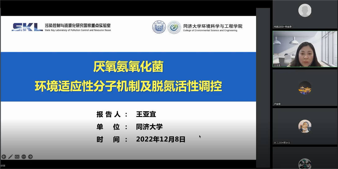 2022年12月9日下午,脱衣舞 第13期环境大讲堂活动顺利举办。本期讲座特邀国家杰出青年基金获得者、同济大学环境科学与工程学院王亚宜教授于线上分享题为《厌氧氨氧化菌环境适应性分子机制及脱氮活性调控》的学术报告。讲座由脱衣舞 院长卢金锁教授主持,学院师生近300人与会交流。会议伊始,卢金锁对王亚宜教授的到来表示欢迎与感谢,并简要介绍了其研究方向、学术成果等相关情况。图1 卢金锁院长主持讲座王亚宜教授首先对厌...