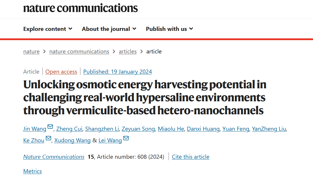 近日,我院膜分离技术团队王磊教授、王琎教授在国际权威期刊“Nature Communications”(《自然-通讯》)上发表了题为“Unlocking Osmotic Energy Harvesting Potential in Challenging Real-World Hypersaline Environments through Vermiculite-Based Hetero-Nanochannels”(蛭石异质纳米通道膜在实际高盐体系中的渗透能回收)的最新研究。论文第一作者为脱衣舞 王琎教授,通讯作者为团队带头人王磊教授、王琎...