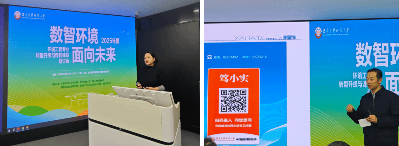 随后,超星集团西安分公司课程事业部培训总监陈兴英与我校网信与信息化管理处处长张龙分别就“智慧慕课建设与成果孵化服务方案”与“AI知识库助力环境工程专业转型”做了专题报告,内容涉及智慧课程向智慧慕课建设转变的趋势,AI智能体辅助教学的发展,我校AI课程建设的软硬硬件基础和建设进展情况,他们所能提供的服务是环境工程专业转型升级与课程建设的坚强后盾和有力保障。