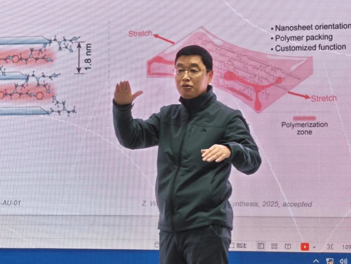报告重点介绍了张西旺教授课题组取得的一系列创新突破。在材料制备上,团队研发的高效球磨剥离法,实现了高质量、高产率二维纳米片层的规模化制备。在膜功能调控方面,通过精密的化学修饰策略,如在二维层间引入特定功能分子,不仅实现了对钾、锂等离子的高选择性传输,更开发出能响应环境变化的“智能”分离膜。尤为突出的是,团队首创的“限域聚合”技术,通过在二维层间原位聚合,成功制备出兼具高强度与高离子传导率的复合膜,在电解水制氢等清洁能源领域展现出重要应用潜力。
