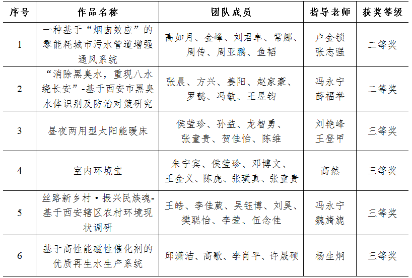 此外,我校4项作品:《昼夜两用型太阳能暖床》、《丝路新乡村·振兴民族魂——基于西安辖区农村环境现状调研》、《室内环境宝》、《基于高性能磁性催化剂的优质再生水生产系统》荣获国家三等奖(三等奖获奖比率为16.31%)。这是我校在此赛事中的最好成绩,获奖数量和层次都取得了较大突破。
