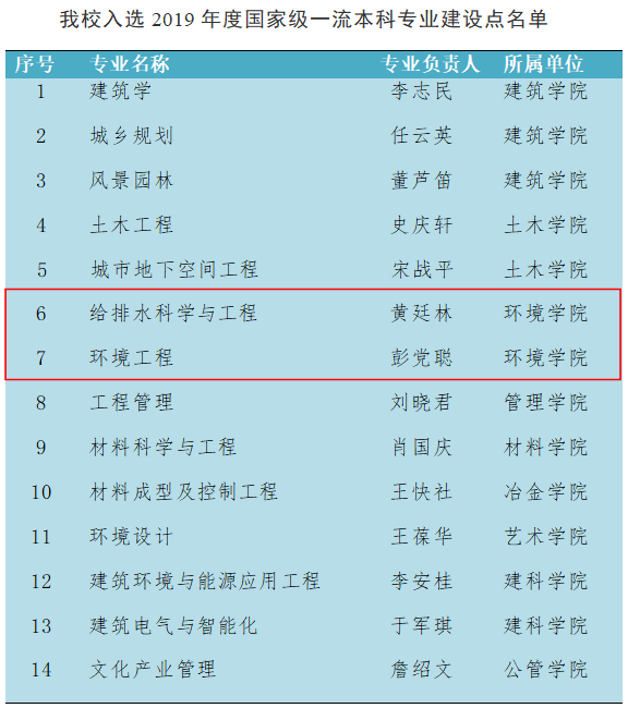 日前,教育部办公厅公布《2019年度国家级和省级一流本科专业建设点名单的通知》(教高厅函【2019】46号),西安建大共有14个专业入选国家级一流本科专业建设点,入选数量位居陕西省属高校第二。我院给排水科学与工程、环境工程专业入选国家级一流本科专业建设点。我校共有22个专业入选省级一流本科专业建设点,其中包括我院环境科学专业。