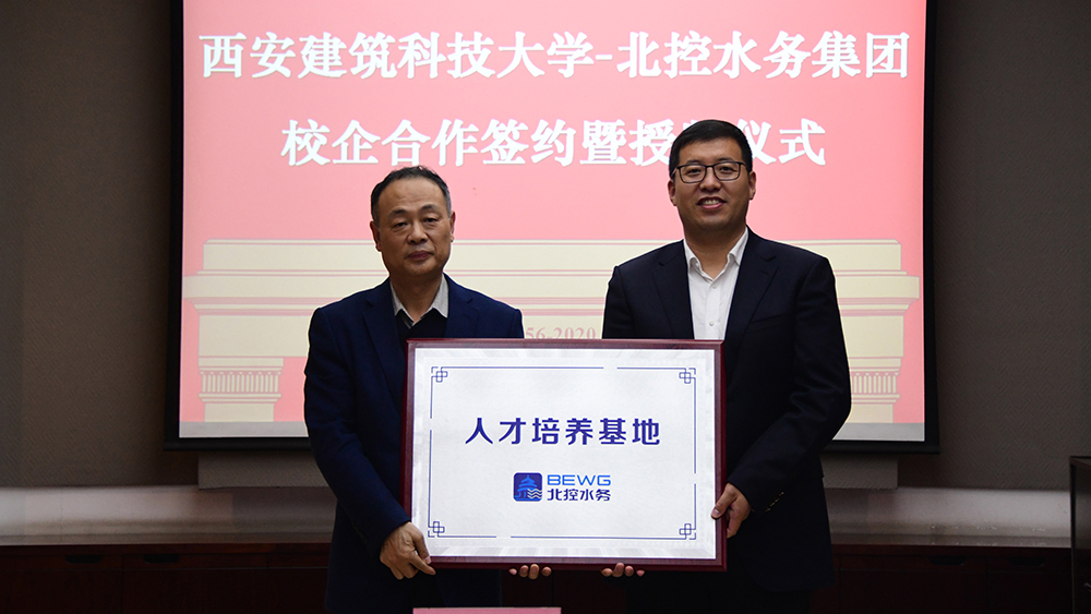 党委书记王劲松向北控水务集团代表颁发校外导师的聘书。校学生工作部(处)马宗方部(处)长、创新创业教育办公室何廷树主任分别向北控水务集团授予“就业实习与社会实践基地”和“校外创新创业教育实践基地”匾牌,北控水务集团人力资源中心副总经理、北控水务学院副院长冀广鹏向学校授予“人才培养基地”匾额,校教务处长肖国庆接牌。