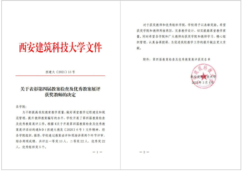 为展示获奖教师个人风采,进一步发挥优秀教师的带动作用,激励全校教师聚焦立德树人,投身本科教学,不断提高我校教育教学质量,做好课堂教学过程建设和规范管理,提升教师教案编写的水平,学校开展了第四届教案检查及优秀教案展评工作。根据《关于开展第四届教案检查及优秀教案展评活动的通知》(西建大教发[2020]6号)文件精神,经各学院组织、推荐,学校通过教案函评和现场讲课两个环节评审,综合两项成绩,共评出一等奖13人、二等奖22人、优秀奖22人,优秀组织奖5个。