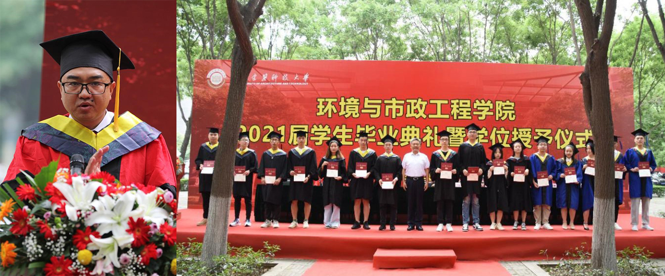 聘任仪式结束,教师代表环境工程教研室吴鹍教授进行了发言,吴老师向同学们圆满完成学业、喜获学位表示了由衷的祝贺,希望同学们走出校门后也要时刻牢记“自强、笃实、求源、创新”的校训,在生活中不断践行,砥砺奋进。毕业研究生代表市政1803樊媛媛同学、毕业本科生代表环科1701贺豪华同学随后也进行了发言。樊媛媛同学向母校表达最衷心的感谢,向辛勤的各位老师表达最诚挚的敬意,她希望同学们在未来的所有的际遇中,认真活在每一个当下,去书写自己的精彩人生,续写建大的华彩篇章。贺豪华同学回忆了自己忙碌却又充实的大学生活,几许苦涩,几许甘甜的四年求学之路将为自己未来发展提供了不竭动力,不论走到哪里,都不会忘记“爱我环工,勇攀高峰”的口号,环境学子会继续发光发热,传播建大精神!