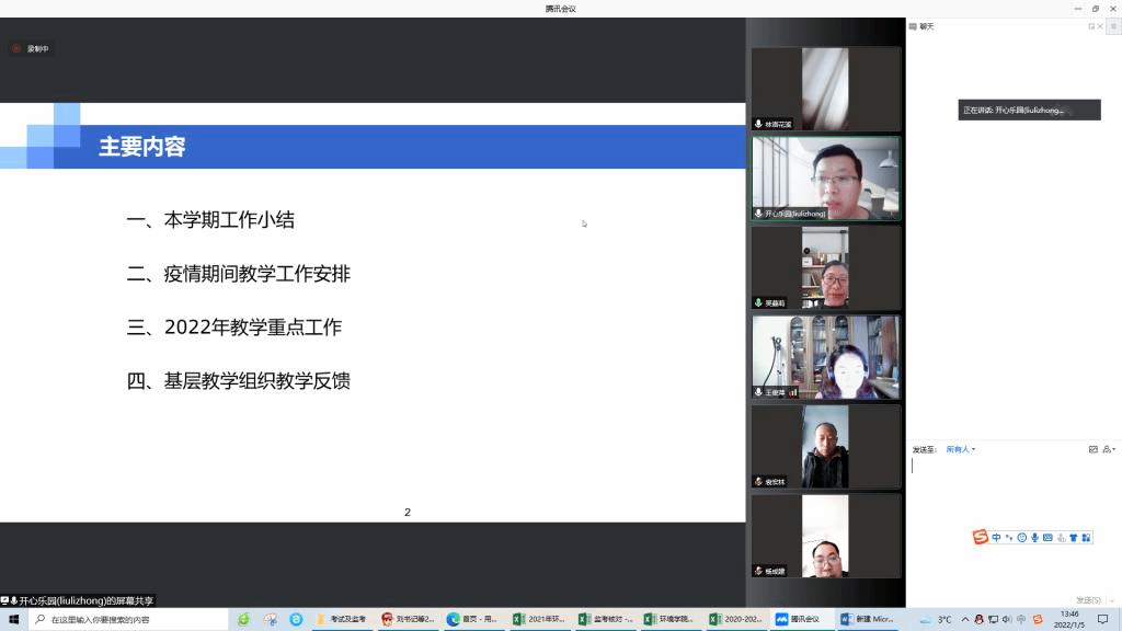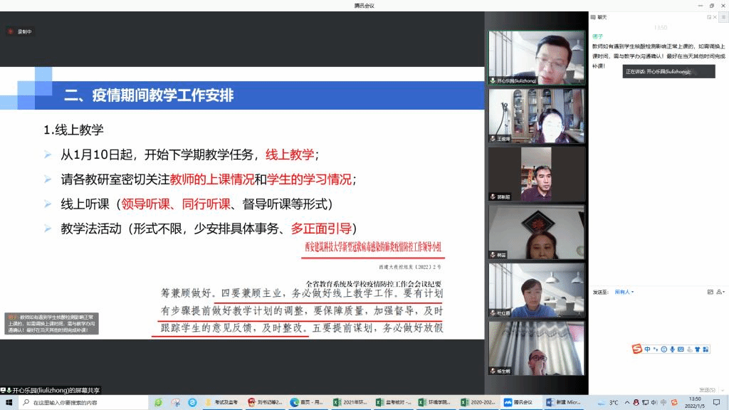 会议首先传达了省市关于疫情防控的部署和学校疫情防控工作要求,自全市封控以来,我院师生员工克服重重困难,于第18周周一(2021年12月27日)准时开展2020、2021级本科生新学期线上教学工作和2018、2019级本科实践教学任务,在线教学运行平稳。要求全体教师,继续坚守阵地,共克时艰,持续推进在线教学有序开展,第20周周一(2022年1月10日)如期开展2018、2019级新学期教学任务。