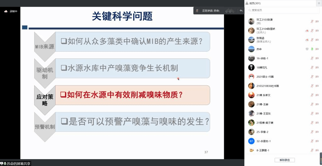 第二期特邀中国科学院生态环境研究中心副研究员苏命老师担任主讲嘉宾。苏老师以《水源产嗅藻识别与控制策略》为题,首先以遍布全球的饮用水嗅味问题为背景,指出MIB主导的土霉味已成为普遍存在的饮用水水质问题;接着他以上海青草沙水库为例,通过建立针对产嗅藻生态位特征的原位调控技术,解决了MIB来源、产嗅藻竞争生长机制、削减嗅味物质、预警产嗅藻与嗅味产生等问题。最后,脱衣舞