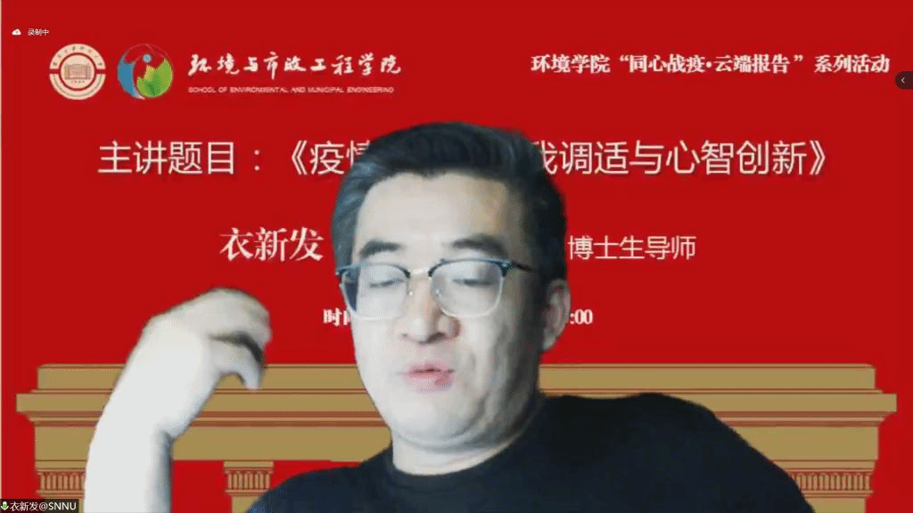 第四期特邀陕西师范大学“教学心理与创造性”研究室主任衣新发教授担任主讲嘉宾。衣老师以《疫情期间的自我调适与心智创新》为题,报告以疫情期间的心理与行为适应为目标,结合健康心理学、压力管理、思维定势与自我反思的相关原理,助力师生控制情绪稳定、建立健康的作息习惯、促进学习与思考、提升媒介素养和信息判断力,实现身心健康发展。最后张海涵教授勉励大家,疫情当下生活及科研工作受限,我们更应该保持客观、冷静的心态,在学习的同时,注重加强锻炼,确保身心健康。