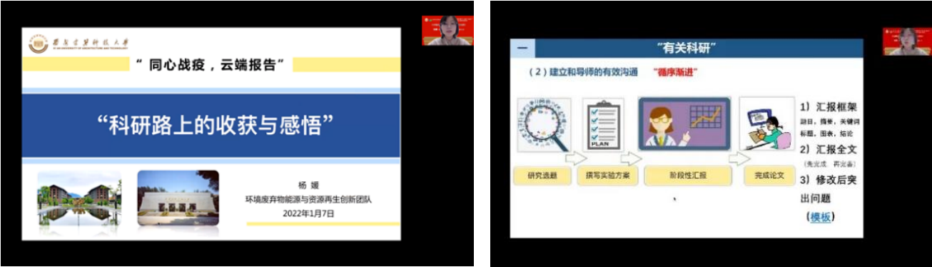 “同心战疫·云端报告”研究生教育系列活动,为学院全体研究生以“隔空不隔爱”的线上方式分享了“科研路上的感悟与收获”为主题的线上汇报。杨老师主要就如何做好科研工作、论文写作等展开了汇报。同时建议大家在面对一件事情的时候不仅要有尽善尽美、追求卓越的态度,也要有面对失败但勇于再次挑战的豁达态度。该报告内容丰富有趣,获得一致好评。这类活动不仅保证了疫情期间研学不断线,也对我院研究生教育的高质量发展起到一定的促进作用。