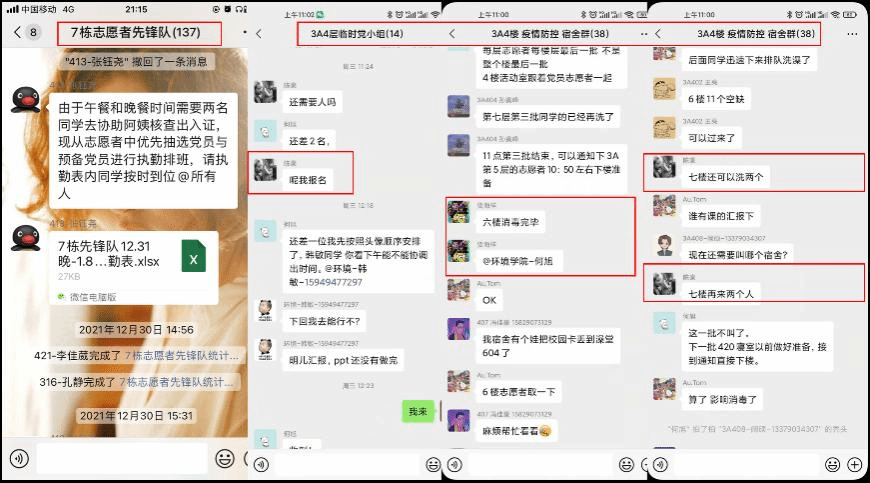 为落实积极落实网格化管理,本支部学生党员杨晓欢加入7栋学生公寓临时组织的志愿者先锋队,参与宿舍楼的执勤工作协助楼管阿姨核查出入证;支部学生党员邢瑶、积极分子陈豪就餐时间在食堂执勤保证学生买饭时保持安全的距离;本支部学生党员姚高飞、贾海祥、积极分子陈豪加入了学生公寓3A栋4楼的临时党小组,积极参与疫情防控工作,参与宿舍楼层的消毒以及宿舍楼洗澡期间的执勤工作。在临时党支部的指导下,本支部学生党员传承本支部党员模范带头作用,积极参与志愿者服务,充分发挥了党支部战斗堡垒作用,并为防疫工作贡献自己的力量。