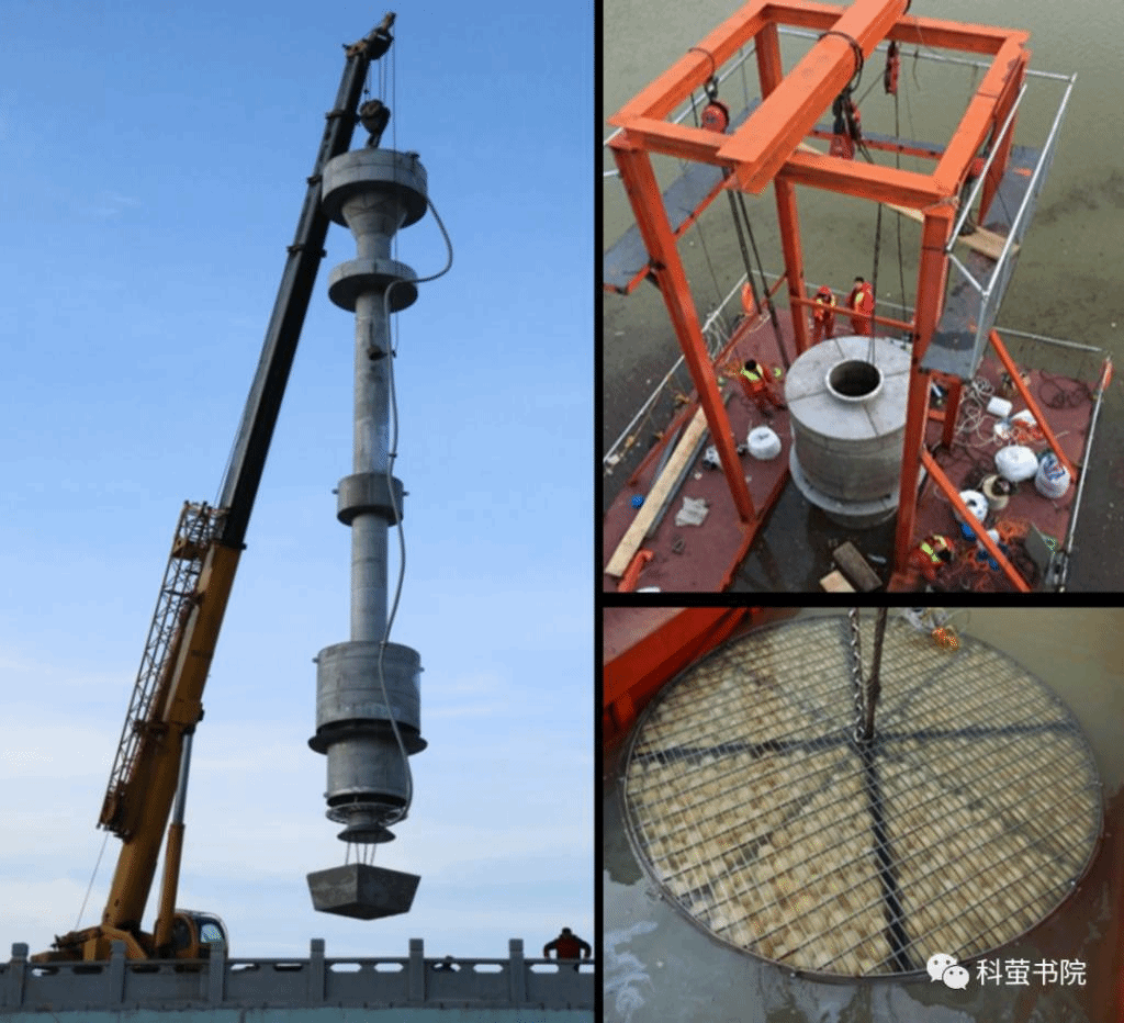 针对西安李家河水库藻类高发问题,2017年底在水库实施了扬水曝气水质改善工程,安装了8台强化生物扬水曝气器(图6)。2018年6月扬水曝气系统运行后,库底溶解氧提高到6 mg/L以上,混合充氧效果显著;与往年同期相比,水库藻密度削减98%以上,相较运行前藻密度削减90%以上;水库中高锰酸盐指数由4.09 mg/L削减至2.21 mg/L,平均削减46%;总氮削减27%。嗅味得到有效去除。扬水曝气系统的运行使水库混合时间提前3个月以上,诱导水库持续自然混合时间延长至6个月,实现了水库水质的持续改善,有效保障了西安市饮用水水质安全,产生了显著的社会效益和经济效益。