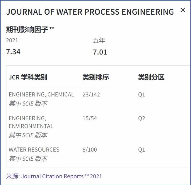 王晓昌教授担任共同主编(Co-Editor inChief)的Elsevier期刊《水工艺工程杂志》(Journal of Water Process Engineering)2021年影响因子达到7.340,在全球21000多种期刊中名列1180位,在水资源类SCI期刊中位列第8位,进入JCR Q1区;在工程化学类SCI期刊中位列第23位,也进入JCR Q1区;环境工程类SCI期刊中名列第15位,为JCR Q2区。