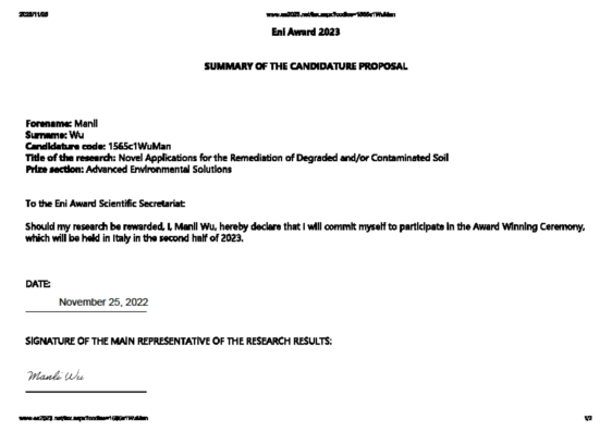 吴蔓莉教授课题组在国家自然科学基金“微生物原位修复石油污染土壤的石油烃残留机制及去除方法研究(21577109)”和“土壤体系中外源氮转化机制及石油烃生物降解强化原理(52070154)”资助下,在石油污染土壤生物修复理论与技术领域开展系列研究,研究成果获得Eni奖2023年度提名。