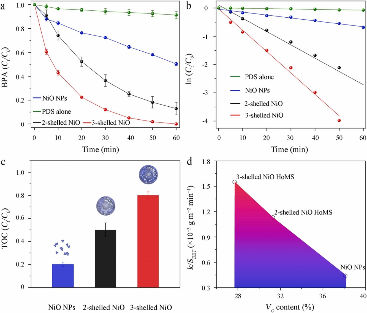 图2. NiO纳米颗粒、2层空心NiO、3层空心NiO活化PDS降解BPA的(a)性能比较,(b)反应动力学,(c) TOC去除效率,(d)归一化反应动力学与氧缺陷浓度的关系。