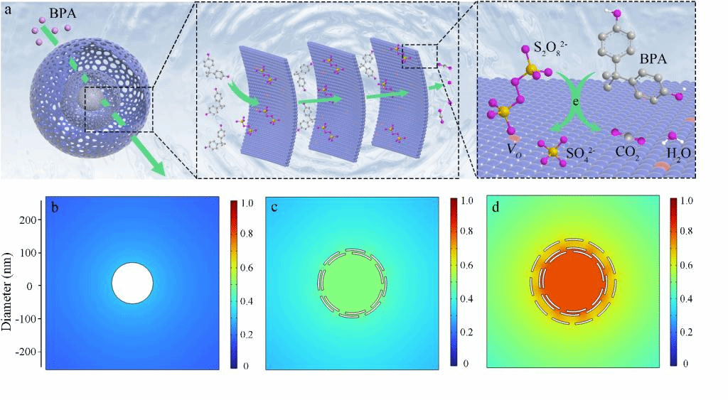图1. (a)空心多层NiO纳米反应器限域催化降解BPA的机理示意图;有限元模拟反应物在(b) NiO纳米颗粒、(c) 2层空心NiO纳米球、(d) 3层空心NiO纳米球上的浓度梯度分布。