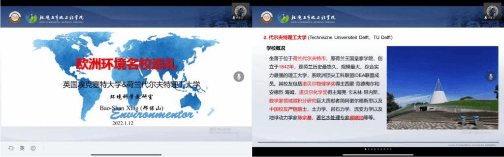 首先由邢保山老师从欧洲环境名校着眼,分享在欧洲环境领域位居前列的埃克塞特大学和代尔夫特理工大学两所世界名校。向大家介绍了两所学校中具有代表性知名学者的研究背景,为同学们未来寻找导师提供了选择。