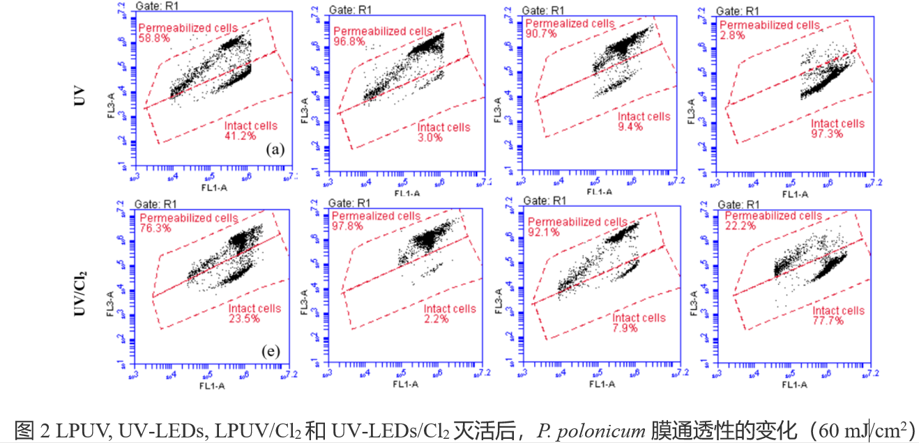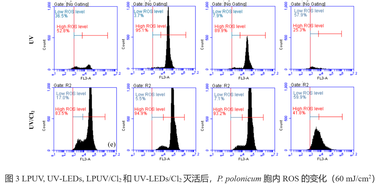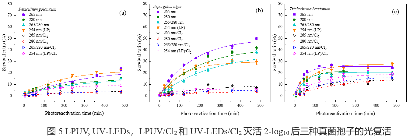 流式细胞仪是一种快速、简单、准确的真菌计数和膜完整性检测的方法,可以代替传统耗时的平板法来计数真菌孢子的数量及活性,也可以用来评估真菌孢子的失活机理。本研究首次采用流式细胞仪的方法评价了LPUV UV-LEDs,LPUV/Cl2和UV-LEDs/Cl2灭活过程中,真菌孢子膜通透性和胞内ROS水平的变化。研究结果表明,在280 nm/Cl2和265/280 nm/Cl2的作用下,真菌孢子的膜损伤更为严重,且能进一步提升胞内活性氧物种的产生。另外,由于紫外诱导的DNA损伤易通过光复活进行修复,需要开发更为高效的消毒方式对真菌的光复活进行控制,而LPUV/Cl2和UV-LEDs/Cl2组合工艺诱导的其他细胞损伤有效抑制了真菌的光复活。