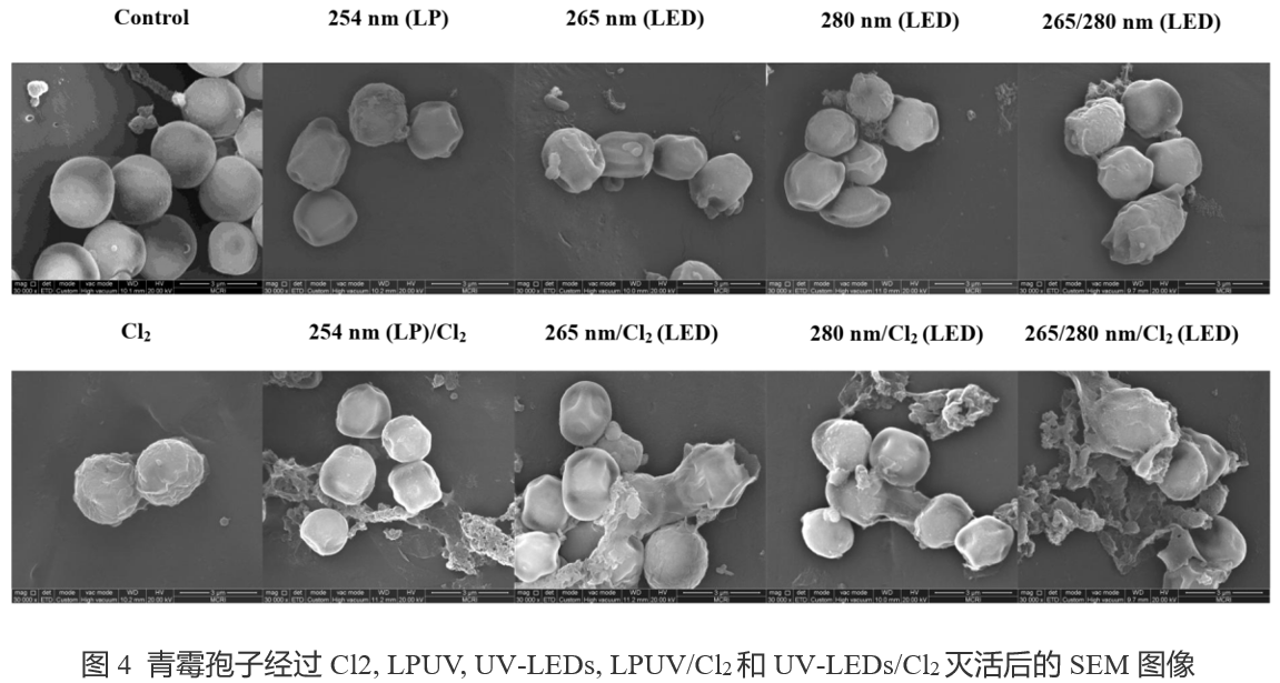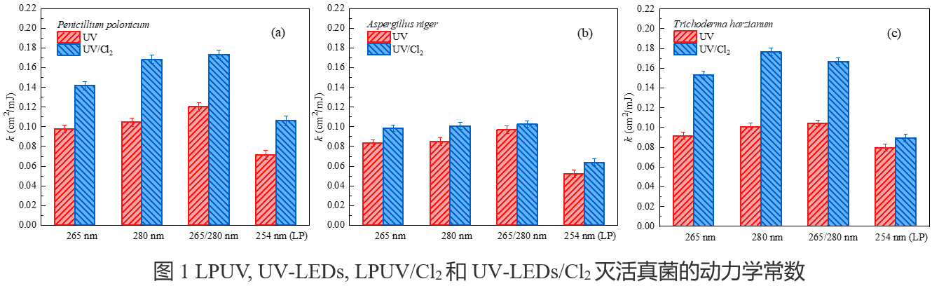 UV-LEDs(紫外发光二极管)因为其体积小使用灵活、可多波长灵活组合,制备过程无汞污染等优点,在饮用水消毒方面受到国际同行的广泛关注。研究结果表明,在单独UV灭活过程中,UV-LEDs的灭活效能优于LPUV,尤其是280和265/280 nm;相较于单独UV工艺,UV/Cl2组合工艺对于真菌的灭活效率更高,UV-LEDs/Cl2的灭活效果优于LPUV/Cl2,且存在协同增效机制。