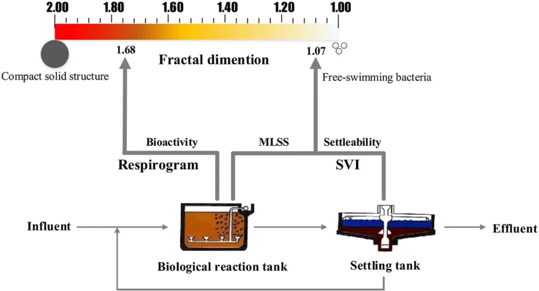 废水生物处理中,活性污泥的生物活性和沉降性能对活性污泥系统的运行至关重要,污水处理厂会根据不同的标准调整这些参数的变化。据研究,活性污泥的分形结构与生物活性和沉降性能之间存在着一定关系,生物活性决定了活性污泥分形维数Df可达到的上限,在其理论最大值为2.0时,无孔致密絮状物占主导地位;沉降性能决定了活性污泥分形维数Df可达到的下限,在理论最小值1.0时,自由游动的微生物占主导地位。在实践中,为了在生物活性和物理结构之间进行权衡以达到更好的性能,分形维数应控制在一个合理的值。然而,分形维数的测量是一个复杂的过程,其在线实施具有挑战性,因此,寻找一种简便的、易于测量的指标来表征和控制活性污泥的生物活性和沉降性能,对污水处理厂的运行管理具有重要意义。