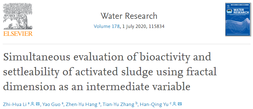 李志华团队长期致力于污水处理厂的精细化运行管理技术研究,突破传统基于水质等物化参数管理的思路,从活性污泥微生物的活性监测和调控着手,对基于生物活性数据的事故预警、节能状态感知等方面进行不断探索。围绕这一技术,团队拥有20余项专利技术,并且污水生物处理精细化运行管理技术被生态环境部列入《国家先进污染防治技术目录(水污染防治领域)》,团队开发的系列智能化产品在陕西、山西、河北、山东、浙江、江苏、广东、甘肃、新疆、宁夏等十余个省(自治区)应用。该团队研究方向包括:污水生物处理理论与技术、污水处理过程优化与控制、物联网与大数据分析等。近日,李志华教授与中国科学技术大学俞汉青教授合作,在环境领域顶级期刊《Water Research》上发表了题为“Simultaneous evaluation of bioactivity and settleability of activated sludge using fractal dimension as an intermediate variable” 的学术论文。李志华教授为该论文的第一作者,与俞汉青教授共同为该文的通讯作者。