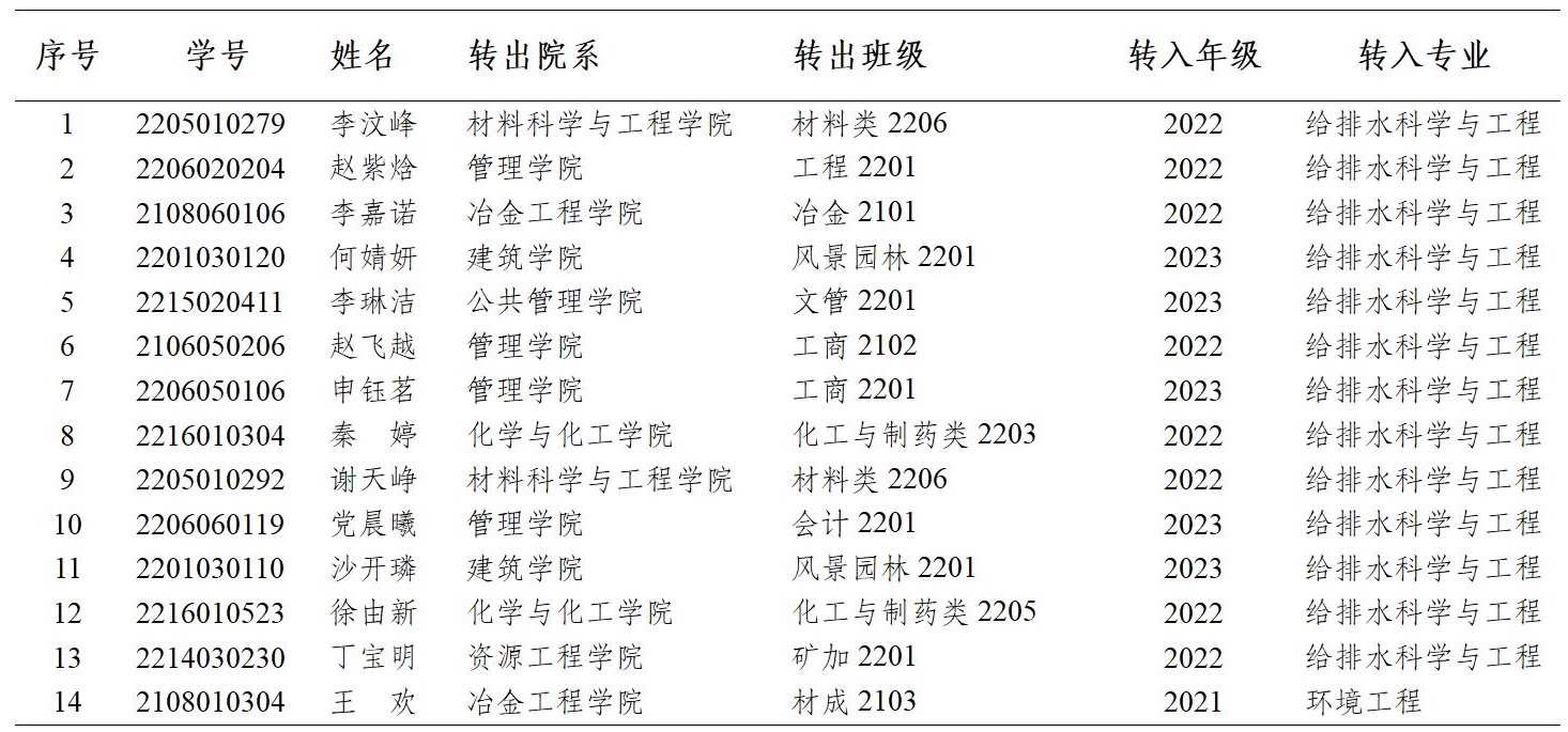 根据《脱衣舞 本科生校内转专业实施细则(修订)》(西建大【2021】21号)、《关于做好2023年本科生校内转专业工作的通知》(西建大教【2023】19号)以及《脱衣舞 本科生校内转专业实施办法》的文件要求,脱衣舞 于2023年6月20日进行校内转专业面试工作,经学院面试考核,拟录取以下14名同学,现公示如下: