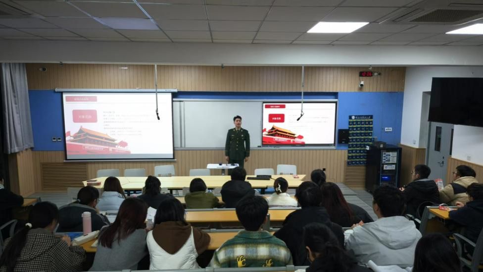 董宇以亲身经历讲述了军旅生活的酸甜苦辣与成长蜕变。从严格自律的作息训练到并肩作战的战友情深,从执行任务时的使命担当到保家卫国的荣耀自豪,真实鲜活的故事深深吸引了在场学生,让大家对军旅生涯有了更为直观深刻的认识,台下不时响起热烈掌声。