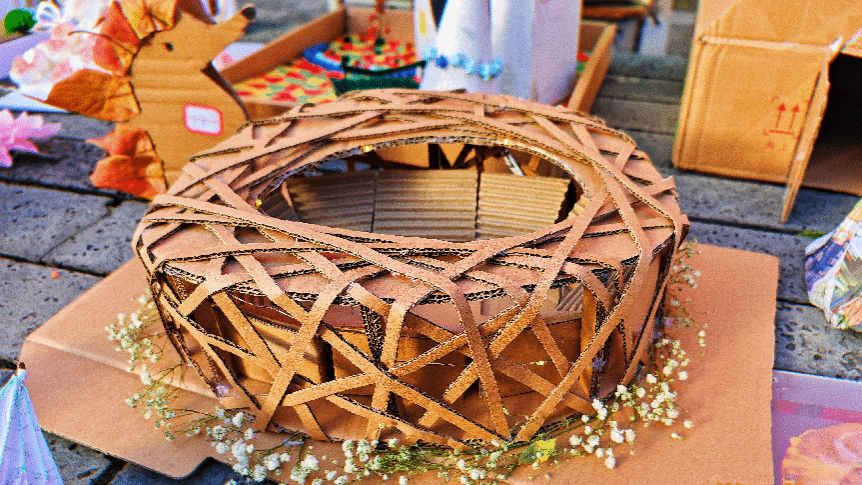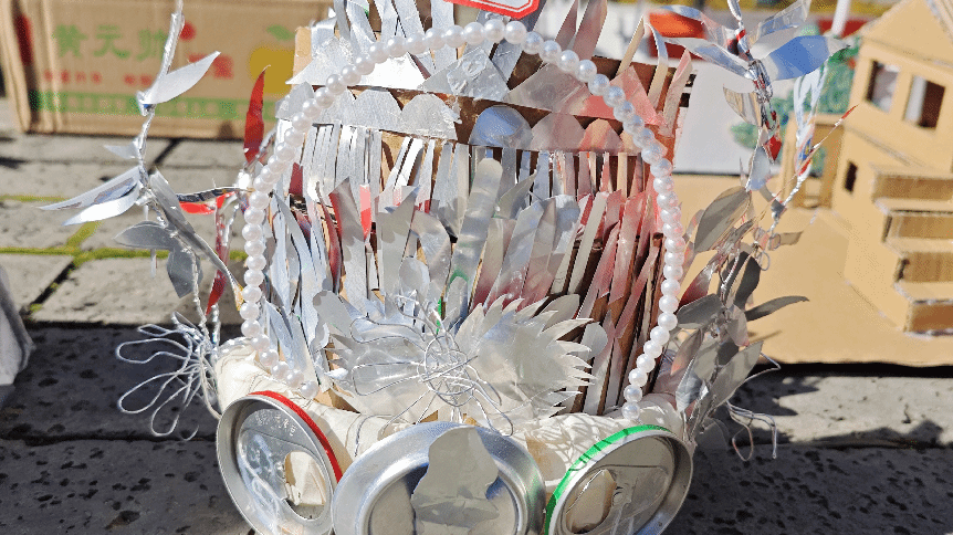 活动现场,一件件匠心独运的作品成为瞩目的焦点。有利用回收木条精心拼接而成的“鸟巢”模型,仿佛接下来就会在这里进行一场精彩的比赛;有使用树枝落叶细心搭建的小木屋,可爱得让人只觉得身临童话世界;还有采用废弃易拉罐制作的凤冠,让人不禁想要戴上它拍照留念。这些佳作皆源自同学们汲取日常生活中的灵感,巧妙运用废弃物料,依托自己的想象力与双手雕琢而成。每一份作品都紧扣活动主题“绿韵悠长 共绘华章”,呼应“以绿色创意,铸就环保未来;携手工之美,共绘生态新篇”的响亮口号,兼具艺术观赏性与环保内涵。